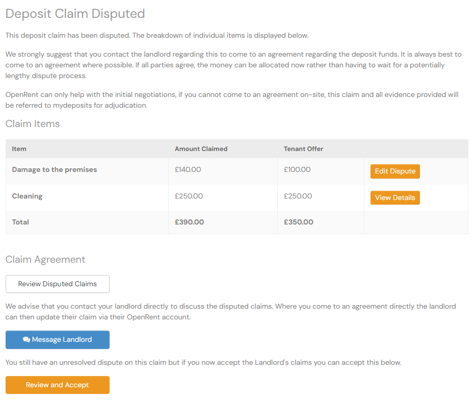 If you wish to dispute all/some of the claim, you can do so via your OpenRent account or via the link in the email notification. Each claim will then be reviewed separately and you will be able to upload the relevant evidence.