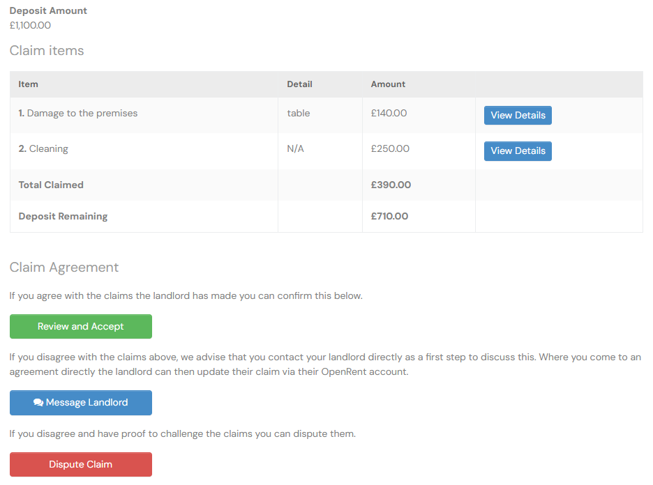 If your landlord has made a claim on your tenancy deposit at the end of the tenancy, we will notify you via email and you will have 7 days to respond to the claim. Accepting or disputing any claim must be done via the lead tenant's OpenRent account.